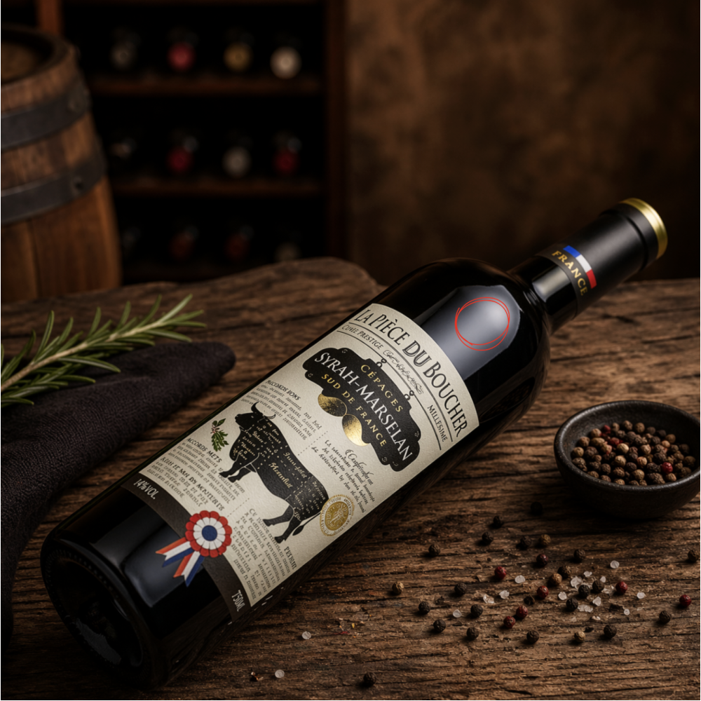 La Pièce du Boucher is een krachtige en verleidelijke rode wijn, gemaakt van Syrah en Marselan, twee druivenrassen die samen zorgen voor diepte, rijp fruit en een zachte kruidige toets.